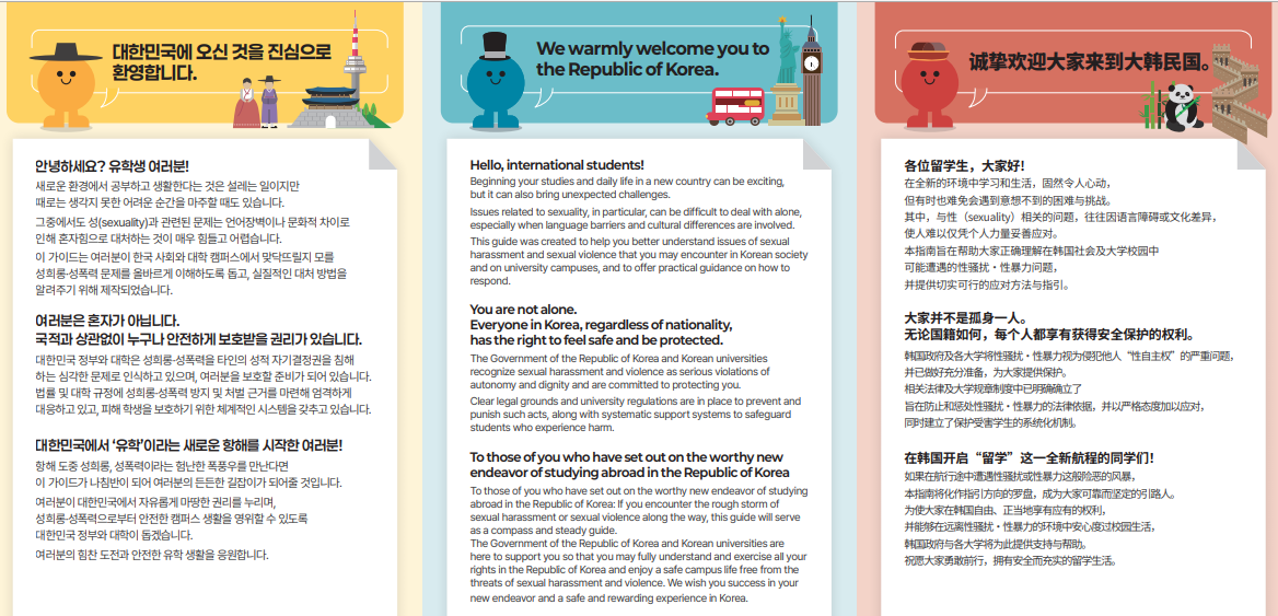 공지사항 세종캠퍼스 외국인 유학생을 위한 「성희롱·성폭력 SOS 가이드」 등록자 : 김미령 등록일 : 2026-03-31 (화) 조회: 25 (한국어)외국인 유학생을 위한 「성희롱·성폭력 SOS 가이드」.pdf (영어)외국인 유학생을 위한 「성희롱·성폭력 SOS 가이드」.pdf (베트남어)외국인 유학생을 위한 「성희롱·성폭력 SOS 가이드」.pdf (중국어)외국인 유학생을 위한 「성희롱·성폭력 SOS 가이드」.pdf (우즈베키스탄어)외국인 유학생을 위한 「성희롱·성폭력 SOS 가이드」.pdf (몽골어)외국인 유학생을 위한 「성희롱·성폭력 SOS 가이드」.pdf (네팔어)외국인 유학생을 위한 「성희롱·성폭력 SOS 가이드」.pdf 목록
