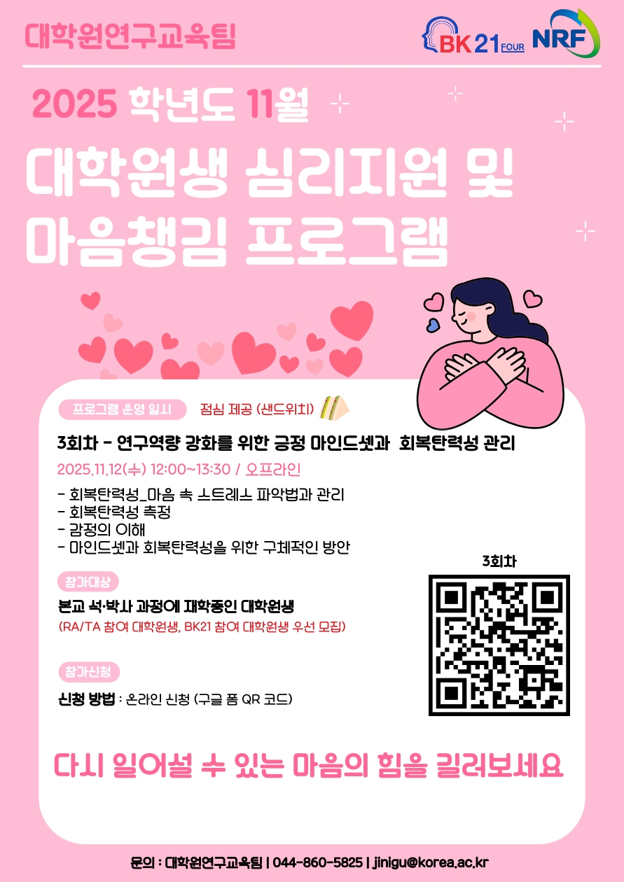 건강한 연구 환경 조성과 대학원생의 연구 몰입도 및 학업 성과 향상에 기여하고자 심리지원 및 마음챙김 프로그램을 진행하고자 합니다.